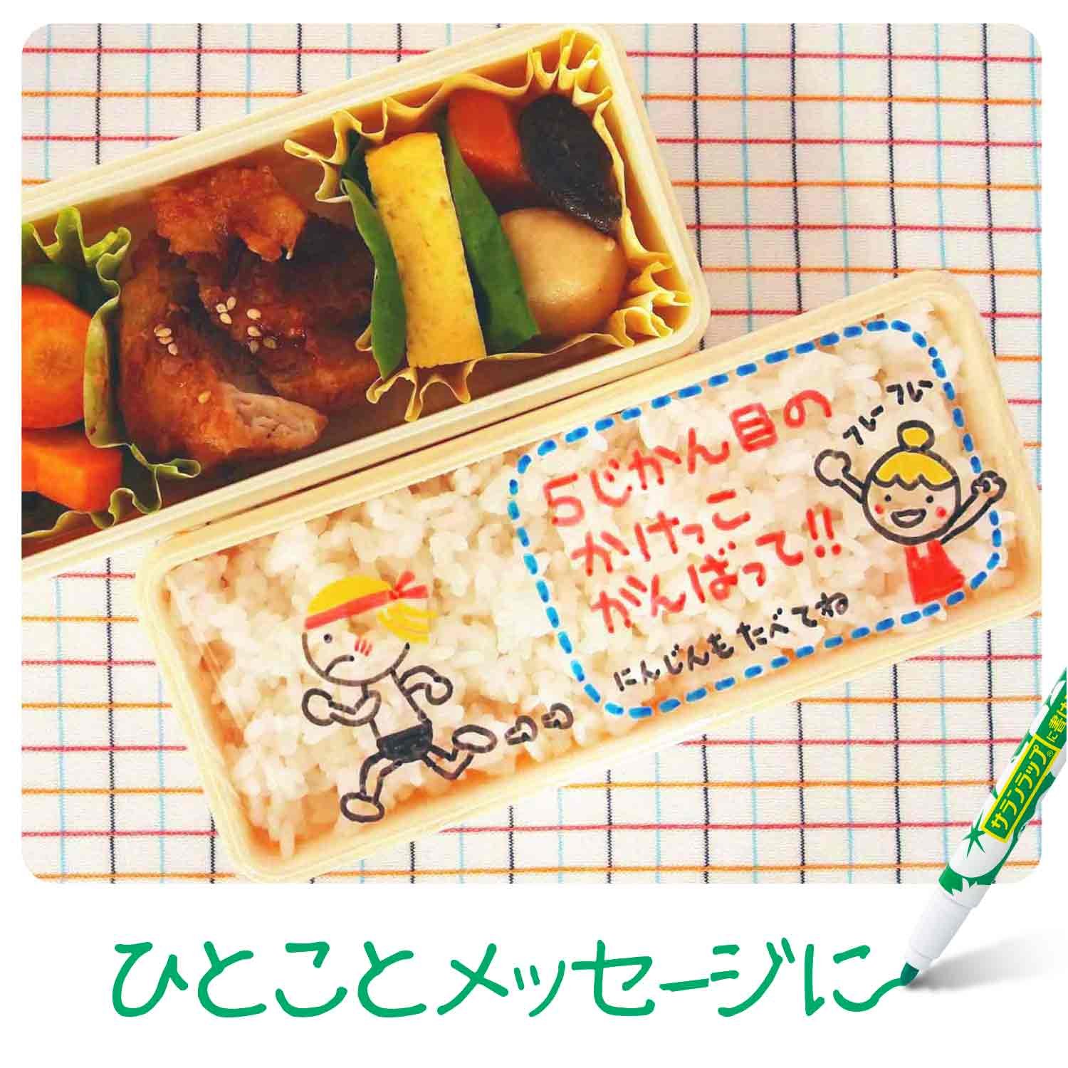名前の通りサランラップに字や絵をかけるペン。おにぎりを包んだラップにメッセージを書いたり、おにぎりの具が何か説明したり、食べる人の名前やイラストを書いたりできる。色は黒・赤・青・緑・黄・白。海苔を巻いて黒いおにぎりになっても白いペンなら文字が読みやすい。